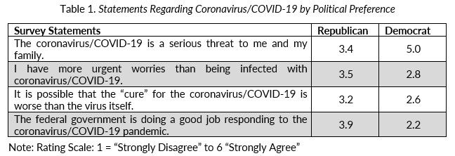 The analytical backdrop for my additional analyses came from my realization that the public’s response and the object of blame for the COVID-19 pandemic is largely divided down political lines. For example, our data indicates that juror perceptions about the seriousness of COVID-19 and the government’s response to the pandemic differs depending on whether respondents were Republican or Democrat. As illustrated in the table below, self-identified Republicans are less concerned about the coronavirus and are more supportive of the government’s handling of the pandemic than self-identified Democrats.[1] Not surprisingly, individuals who indicated that they planned to vote for President Trump in the November 2020 presidential election also significantly differed in their responses to these statements compared to individuals who indicated that they did not plan to vote for President Trump.